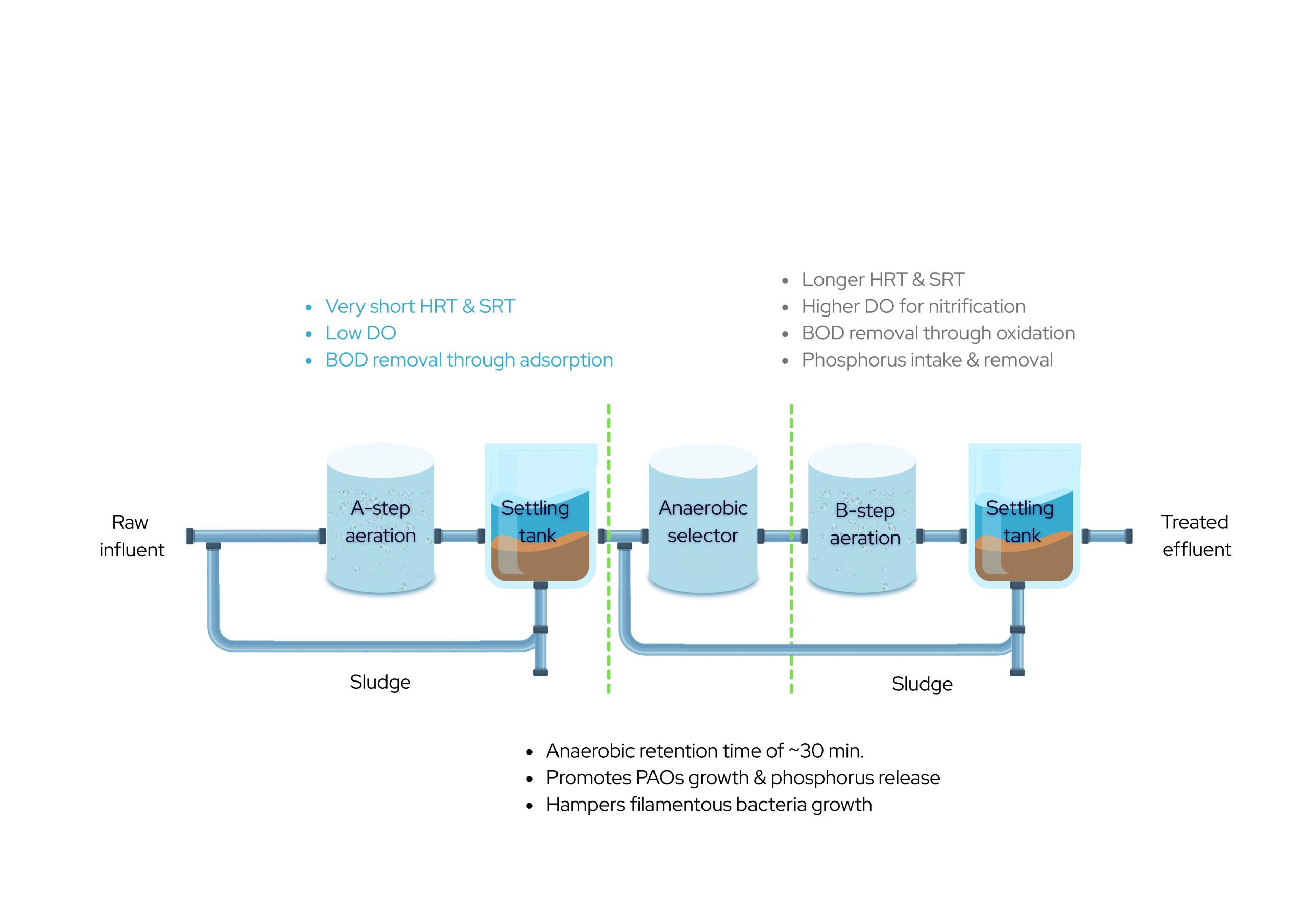 In the first step (A phase), organic matter is decomposed via adsorption and in the second step (B phase) via bio-oxidation. Between these steps is an oxygen-free (anaerobic) phase where nitrogen and phosphate are removed. The result is a treated effluent that can be discharged or reused.